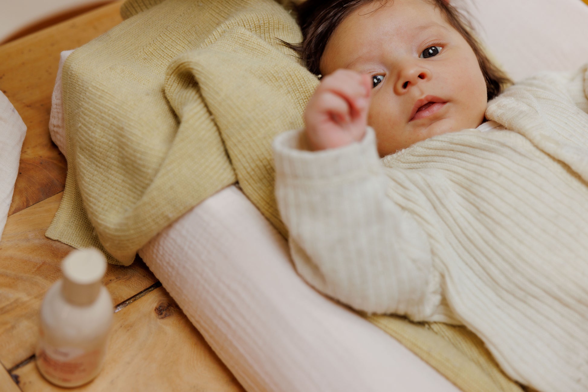 Doe een paar druppels in de palm van uw hand en masseer de olie zachtjes in de huid van uw baby.